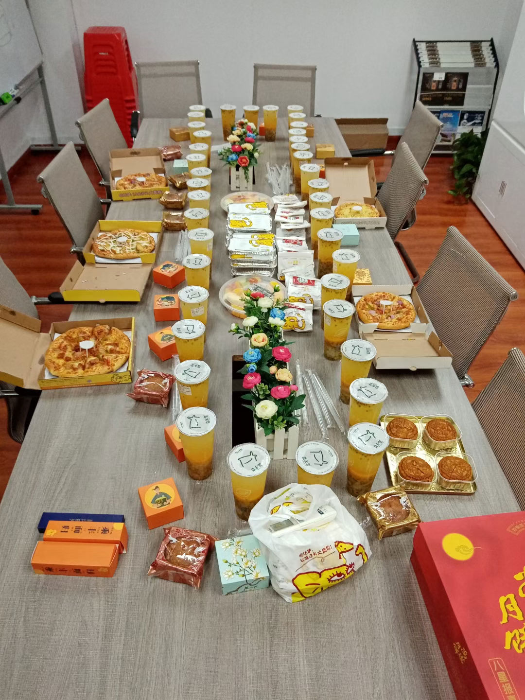 活動開始后,公司各部門同事積極參與,下午茶營養豐富、品種多樣,有披薩、月餅、燒烤、飲料等。拿到暖心的下午茶點心,個個露出了開心的笑容。