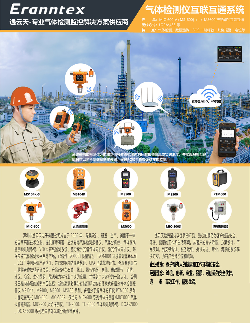 逸云天此次參展產品為氣體檢測儀、無線互聯互通氣體在線監測系統,適用于罐體檢修、化工園區內有毒有害氣體及可燃性氣體的泄漏監測報警,同時可以遠程查看視頻監控及數據濃度等。
