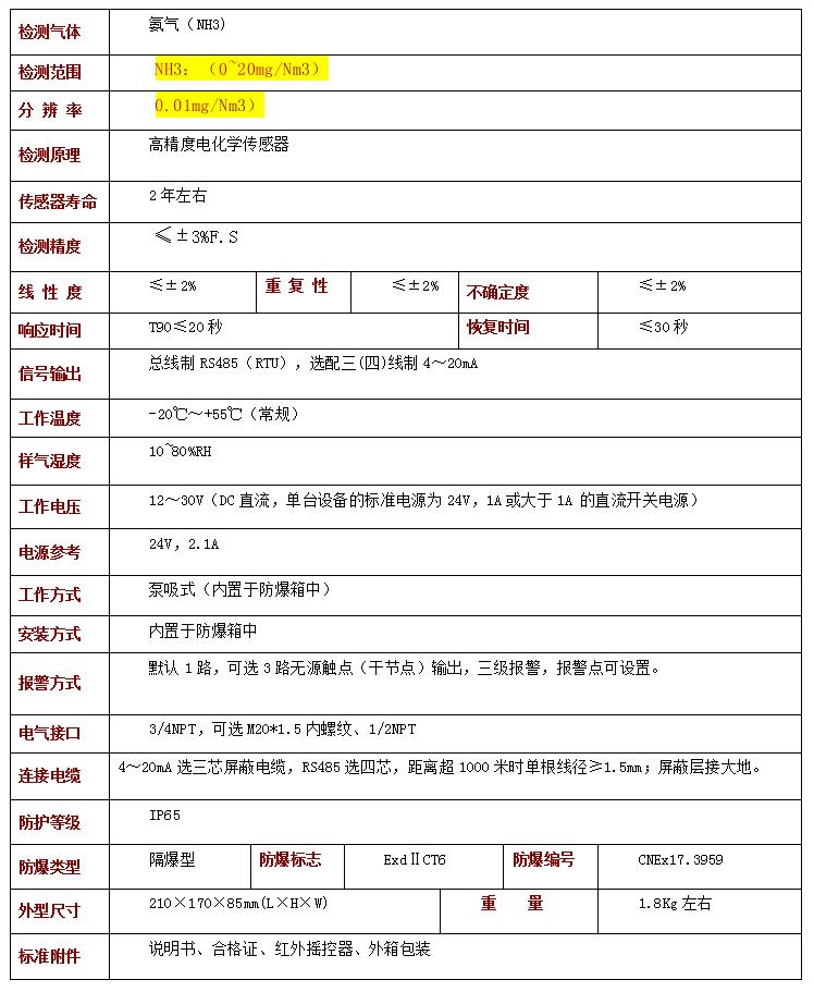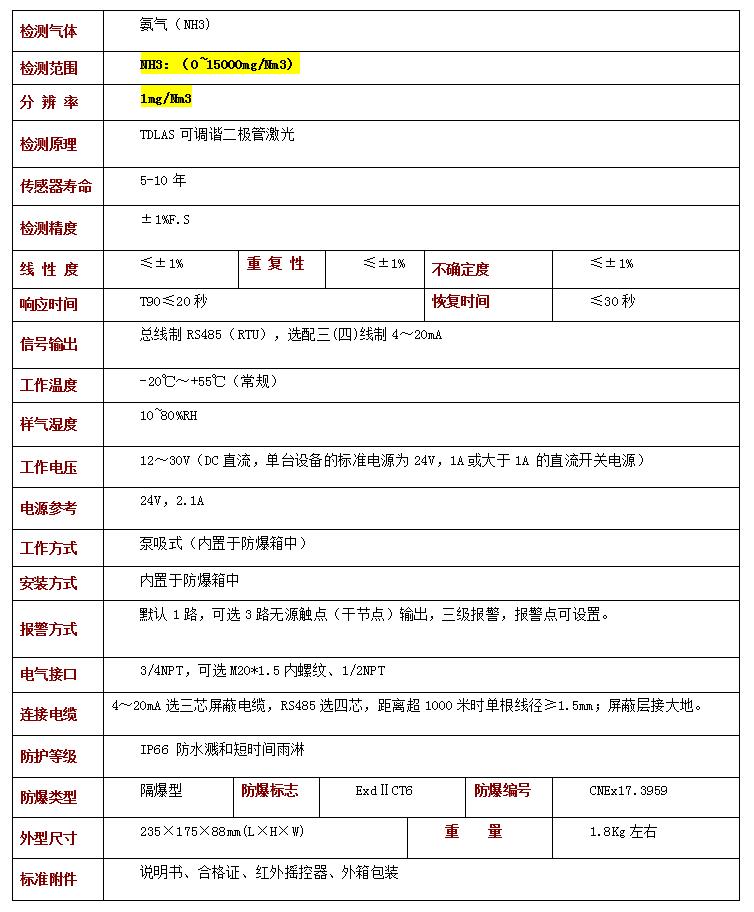 內(nèi)置激光氨氣檢測儀技術(shù)參數(shù)