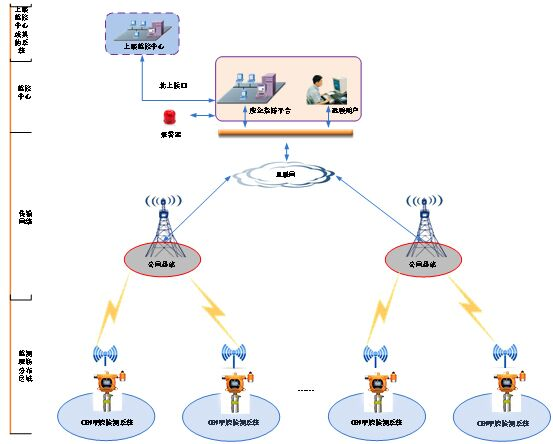系統(tǒng)由前端監(jiān)測設(shè)備、傳輸網(wǎng)絡(luò)、后端應(yīng)急管理平臺等組成,實現(xiàn)在線實時監(jiān)測。用戶可使用移動終端,電腦查看監(jiān)控中心數(shù)據(jù)。