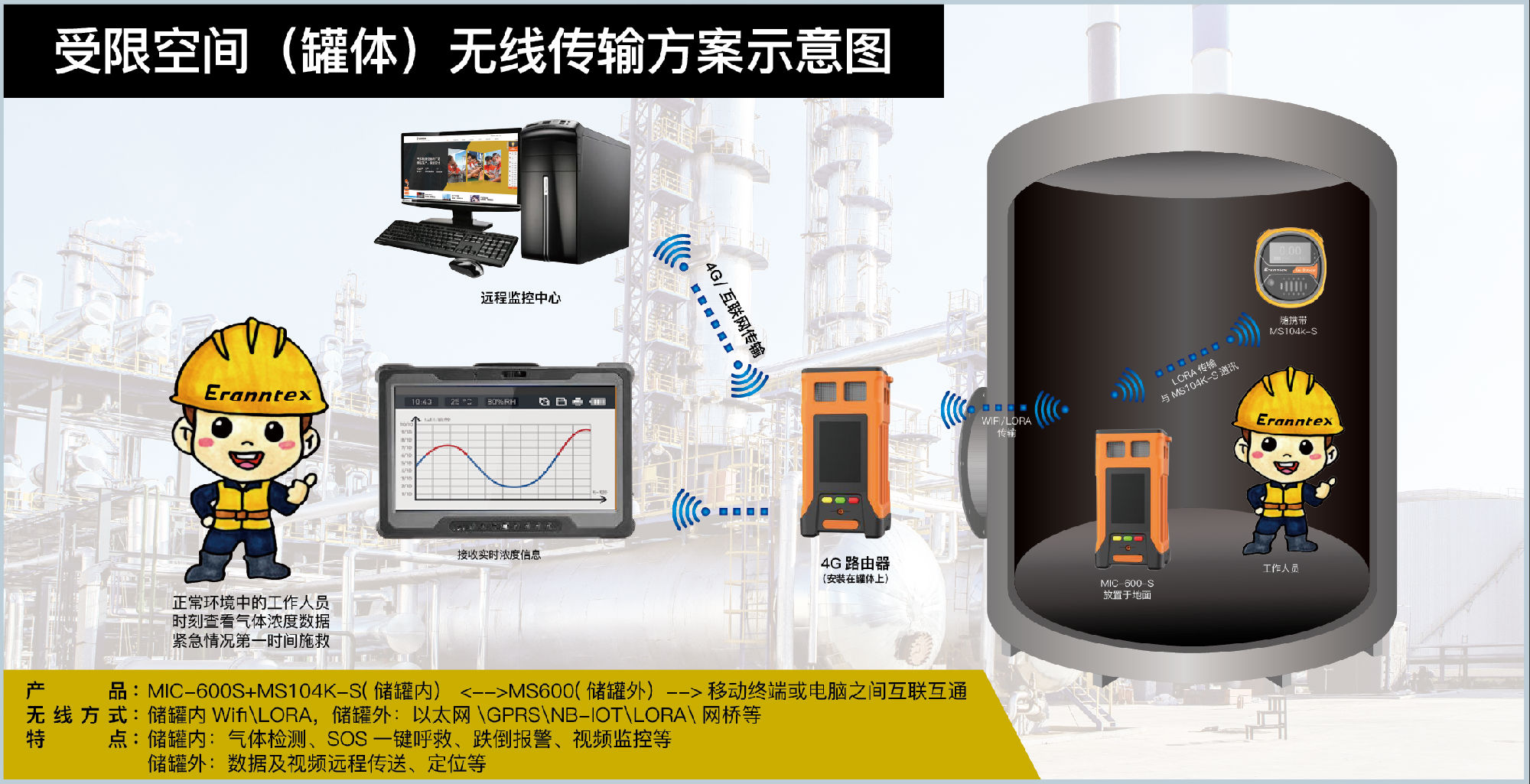 作業(yè)中,監(jiān)測(cè)主機(jī)在受限空間外。施工工人佩戴一臺(tái)便攜式檢測(cè)儀PTM600-S進(jìn)行作業(yè),隨時(shí)檢測(cè)所處環(huán)境的氣體濃度狀況,外邊監(jiān)護(hù)人員可通過(guò)手機(jī)或ipad進(jìn)行查看監(jiān)測(cè)數(shù)據(jù)。必要時(shí),可在內(nèi)部增加中繼設(shè)備延長(zhǎng)傳輸距離。
